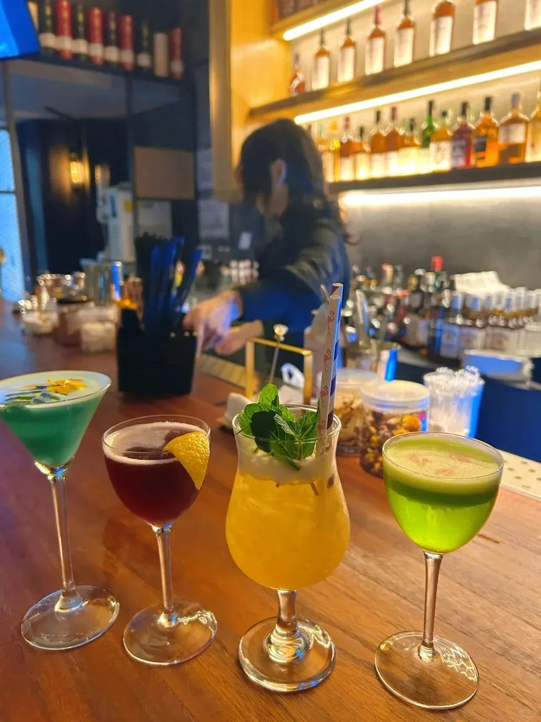 整体是欧式复古的风格暖黄的灯光洒下来满墙的酒柜整整齐齐调酒师小哥哥手法超级专业每一杯特调端上来都像艺术品