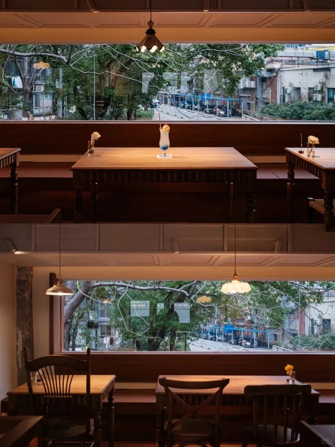 一楼已经很舒服了但二楼才是真正的亮点扶梯口正对着一张两人小桌墙上还有一扇独属于这个位置的小窗旁边是长长的窗户刚好能看到外面的一抹绿意坐在那里用16:9的比例拍一张电影感直接拉满