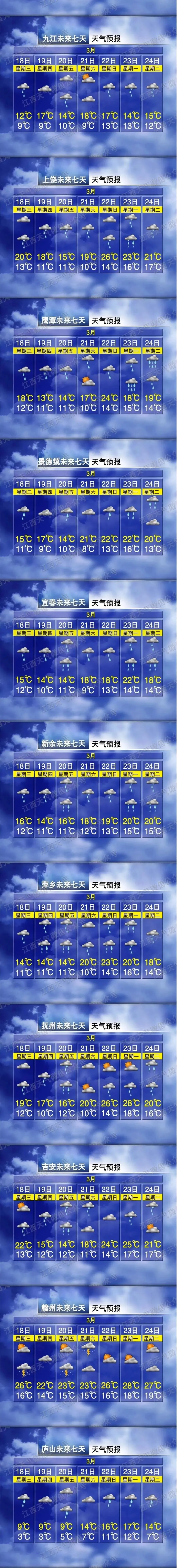 23~24日:赣北、赣中阴天间多云,部分地区有阵雨或雷阵雨,局部地区有中到大雨;赣南多云。气温升高,全省大部分地区最高气温将达21~26℃。