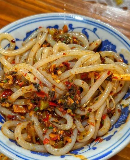 和南昌的米粉不同,景德镇的碱水粑讲究的是"韧"。**那碱水味一上来,整个人就精神了,配上辣椒和酱油,滋味在嘴里炸开,比闹钟管用多了。**这里的特色是"冷粉+饺子粑"的组合。