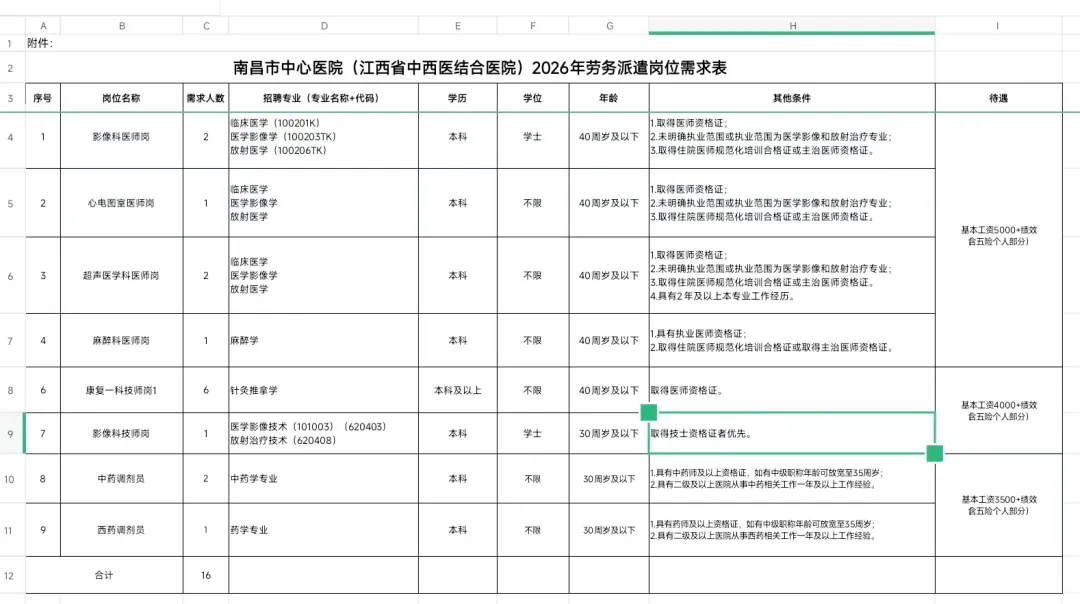 2.薪酬待遇:基本工资3500-5000元/月(具体标准详见《岗位需求表》),绩效工资参照医院绩效考核方案执行;享受工作餐补贴,缴纳社会保险。