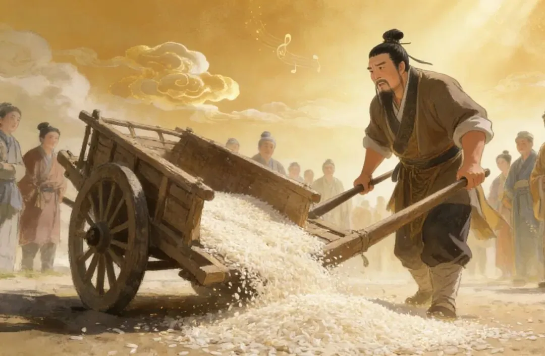 我第一次听到这个故事,脑子里就一个画面:一个仆人推着车,满头大汗往家跑,米撒了一地,然后那些米自己又长出来。像童话一样。