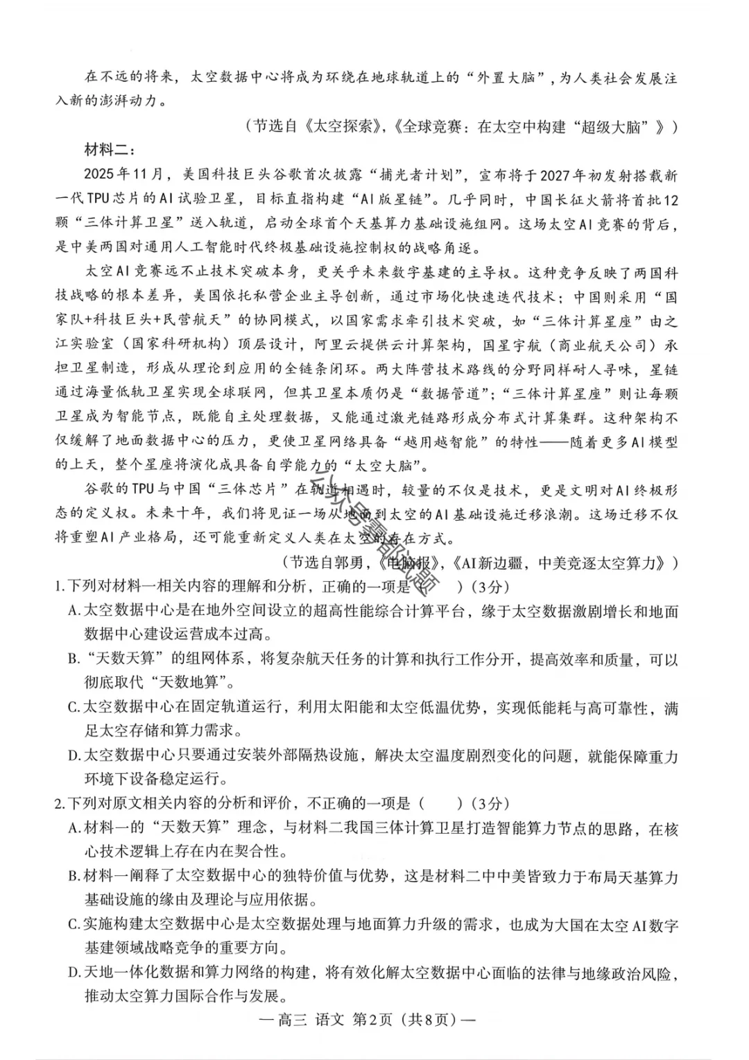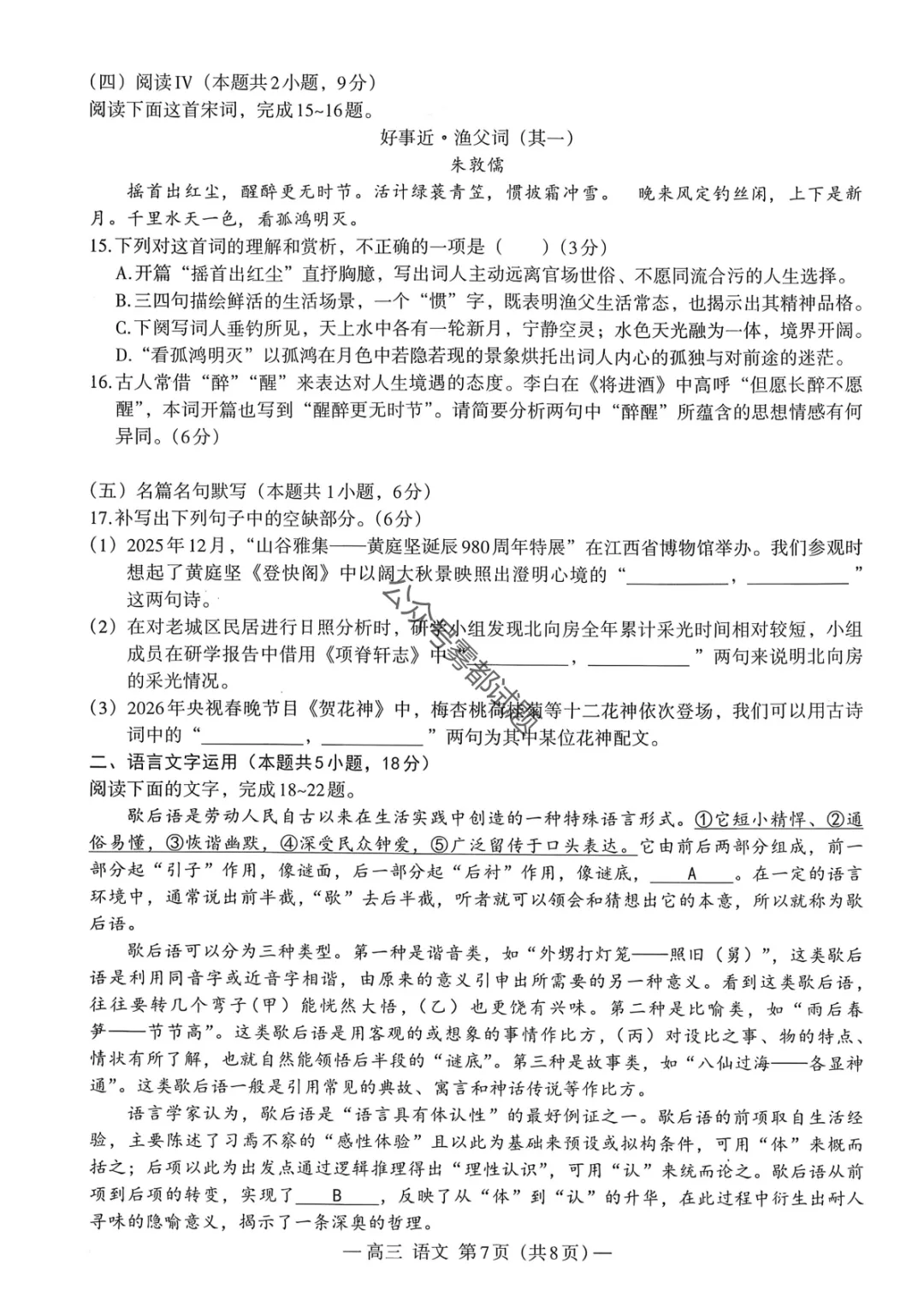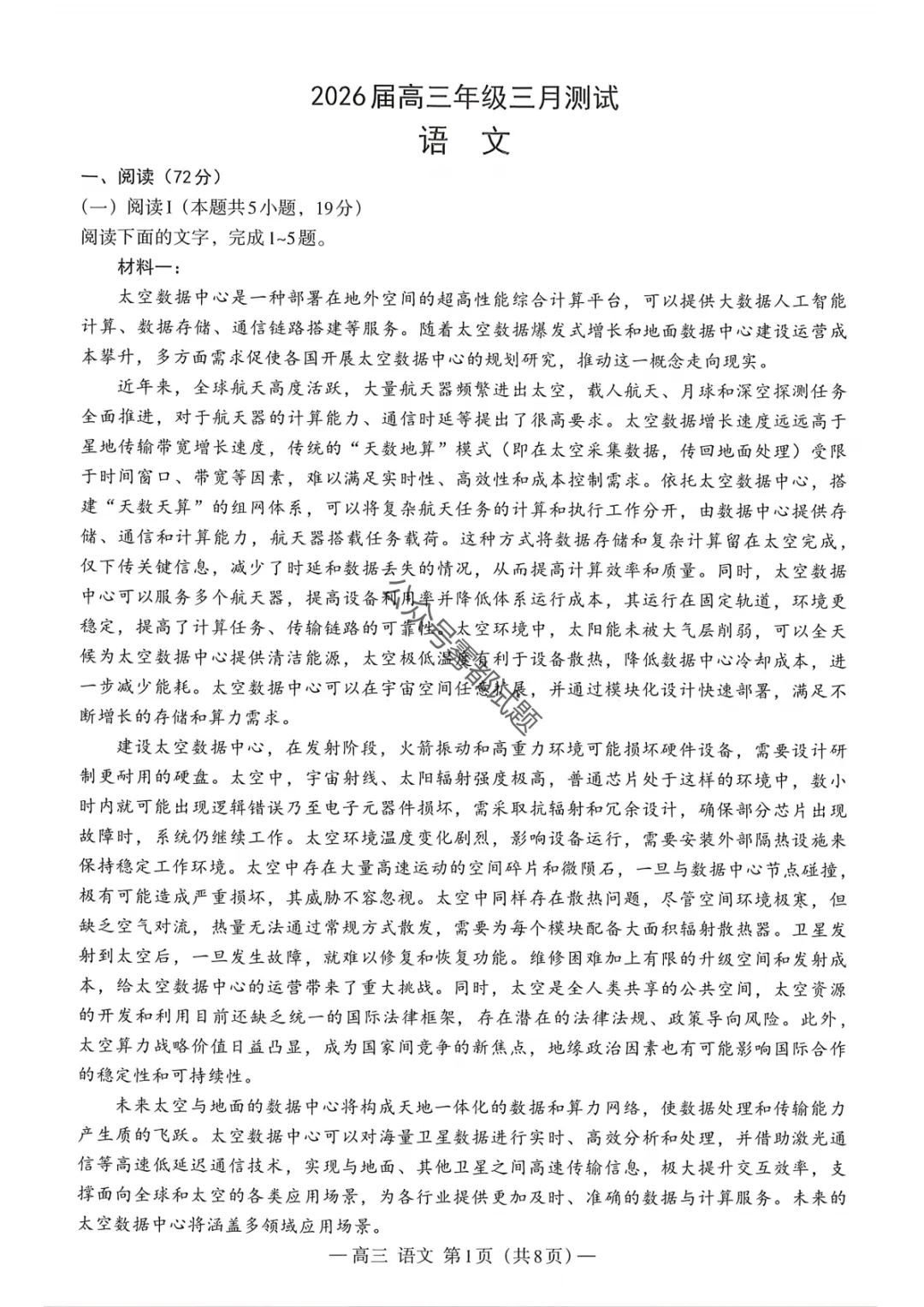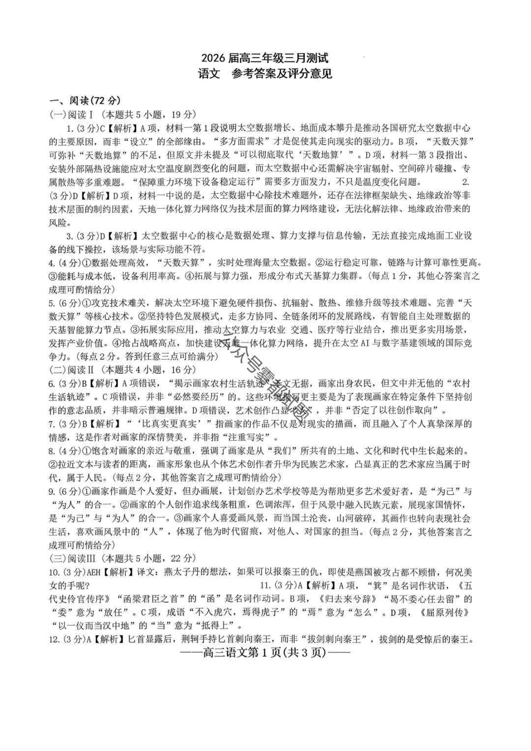 【南昌一模】2026届南昌市高三年级三月测试语文/数学试题及标准答案