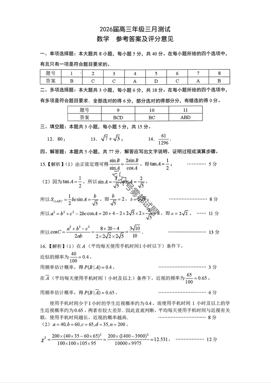 >【南昌一模】2026届江西省南昌市高三年级三月测试答案