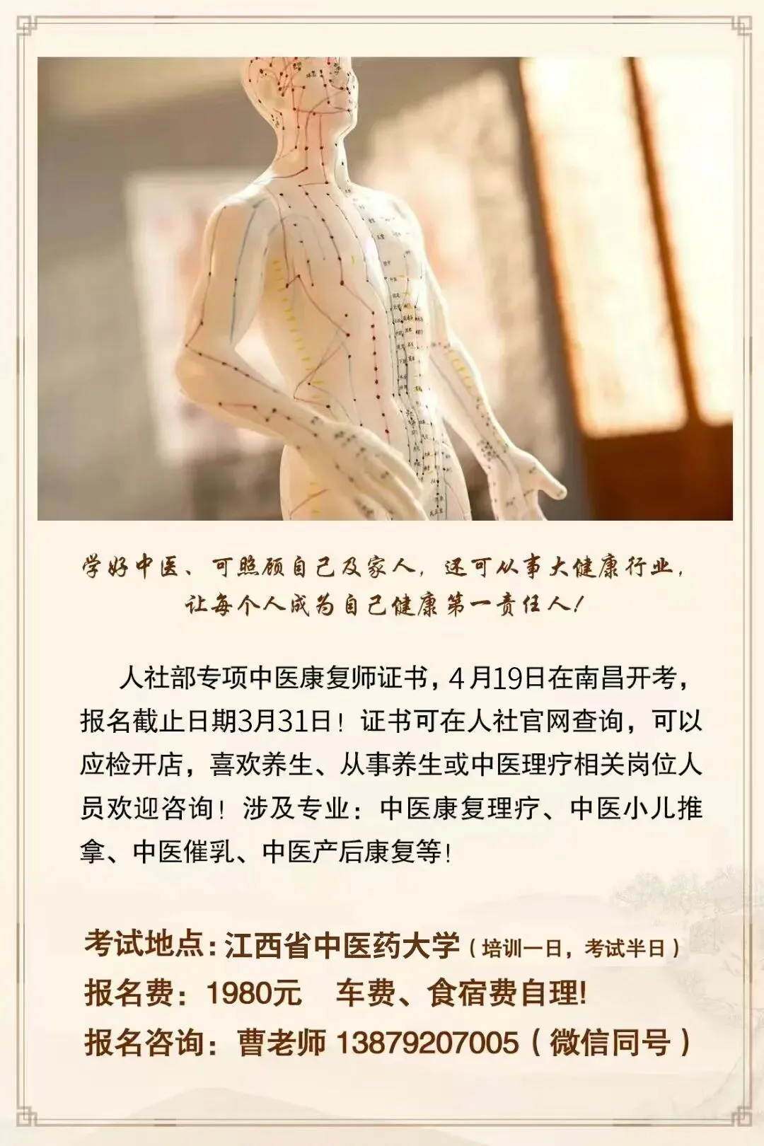 学好中医、可照顾自己及家人,还可从事大健康行业,让每个人成为自己健康第一责任人! 人社部专项中医康复师证书,4月19日在南昌开考,报名截止日期3月31日!