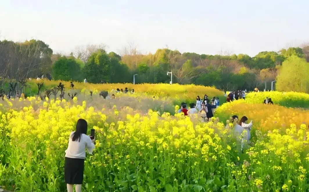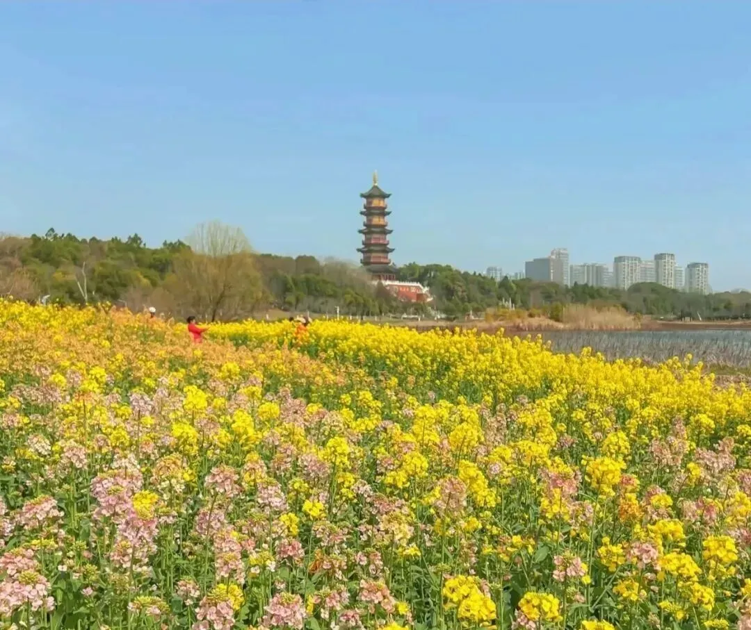 春天怎么能少得了那片治愈系的“金黄”?步入象湖湿地公园,万寿塔下,彩色油菜花从塔基一路蔓延至湖岸。黄、粉、白、紫各色相间,与远处的阁楼、湖水相映成画。记得穿浅色系衣服哦,白色、杏色最佳,搭配花海自带的“柔光滤镜”,你就是花中仙子。
