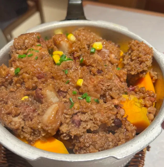 友情提示:吃粉蒸肉时配一盅清爽的米酒,口味和谐,汤一喝,人就醒了。