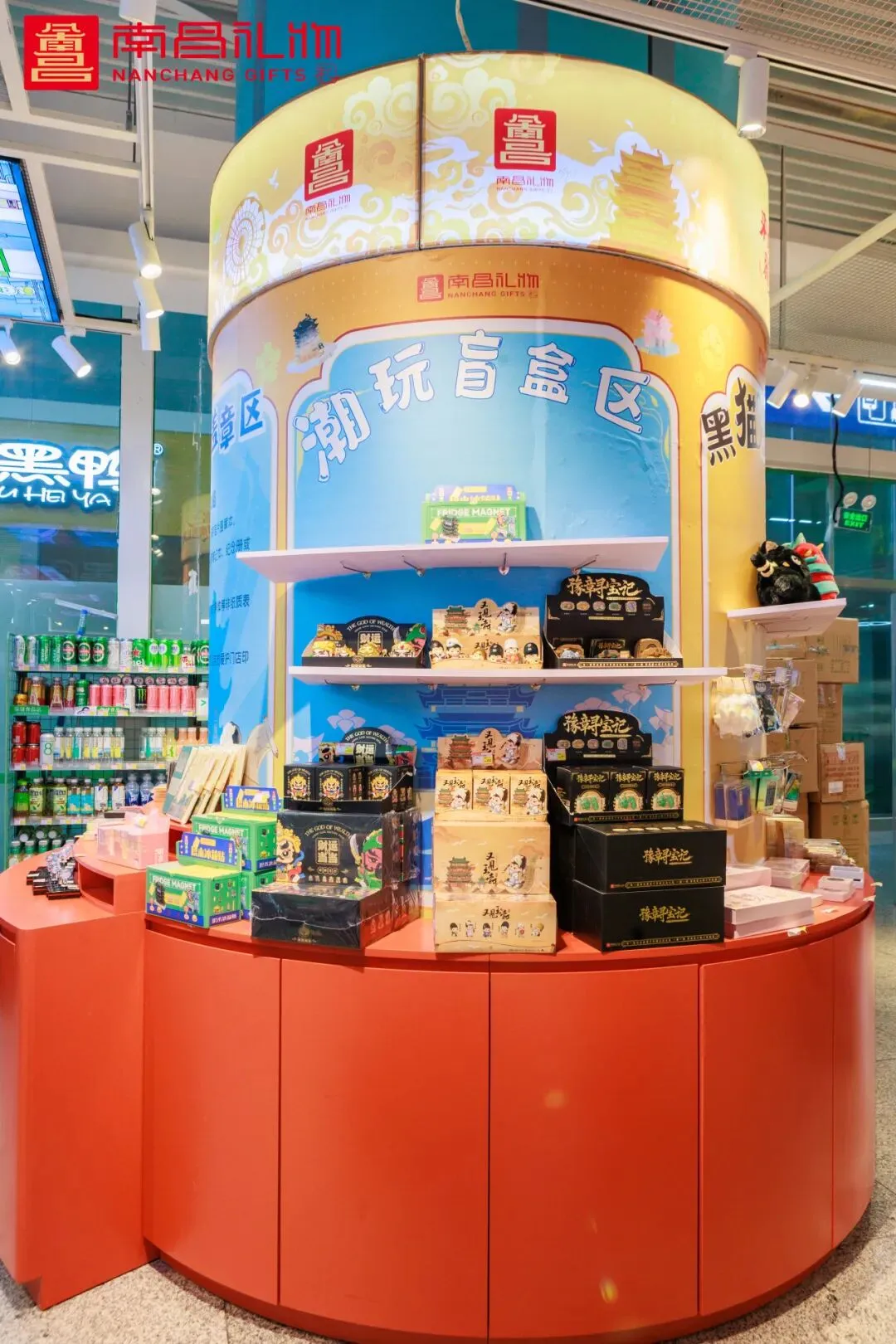在这里,旅客可以在明信片盖章区拿起印着滕王阁、八一大桥的风景明信片,亲手盖上免费的城市主题印章,把南昌的风与月封进纸页;也能在黑猫白猫系列区邂逅以“滕宝”“黑猫白猫”为代表的活泼形象,看它们如何用创意重构滕王阁、万寿宫这些老地标;潮玩盲盒区藏着小惊喜——把瓦罐汤、拌粉这些南昌烟火气打包进盒子,拆盒的瞬间就是一次趣味互动;赣味食族系列区更有意思,把江西特色糕点做成文创摆件、毛绒玩具,让舌尖的味道变成可以抱在怀里的温暖。