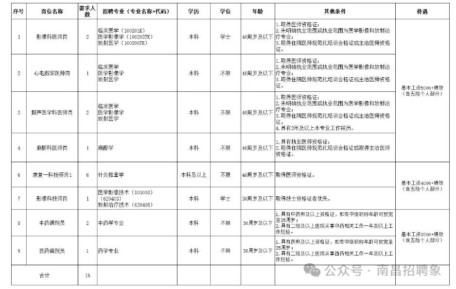 2.薪酬待遇:基本工资3500-5000元/月(具体标准详见《岗位需求表》),绩效工资参照医院绩效考核方案执行;享受工作餐补贴,缴纳社会保险。