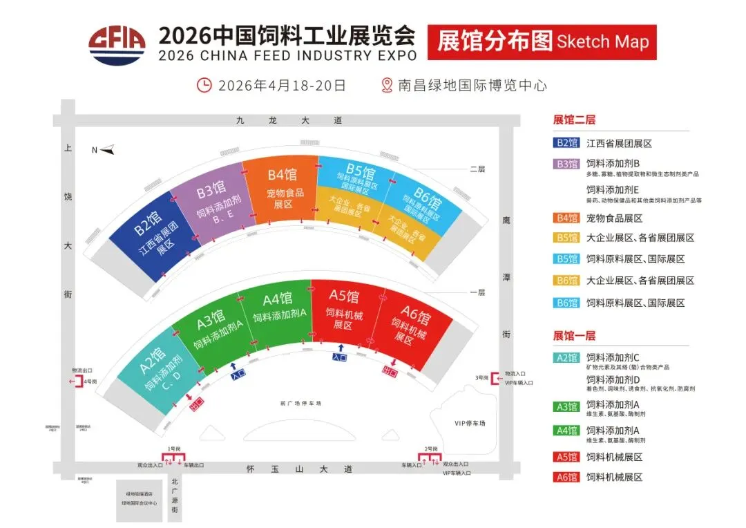 您好!2026中国饲料工业展览会定于4月18-20日在江西南昌举办,本届饲料展将使用南昌绿地国际博览中心10个展馆(A2-A6馆; B2-B6馆),展览展示面积为10万平方米。