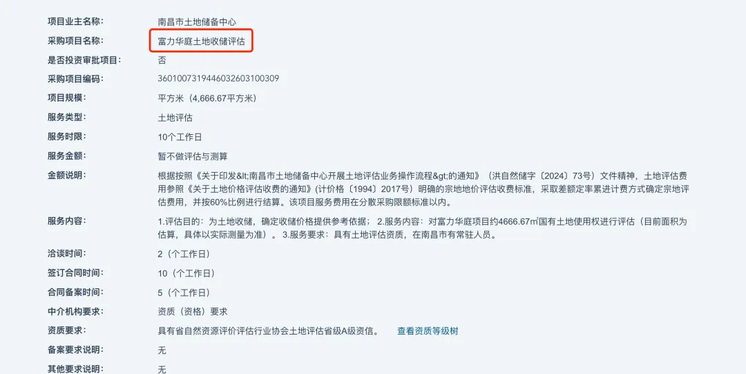 富力华庭土地收储评估采购业主为南昌市土地储备中心;采购项目编码3601007319446032603100309;项目规模为4666.67平方米(7亩);服务类型为土地评估;服务内容为为土地收储,确定收储价格提供参考依据;对富力华庭项目约4666.67㎡国有土地使用权进行评估(目前面积为估算,具体以实际测量为准)。 2017年5月,富力以总价11.77亿元,楼面价8522元/㎡拿下红谷滩新区DAEJ2017006地块,打造富力华庭,该项目规划建设安置房、住宅、临街商业、公寓以及超高层办公楼。