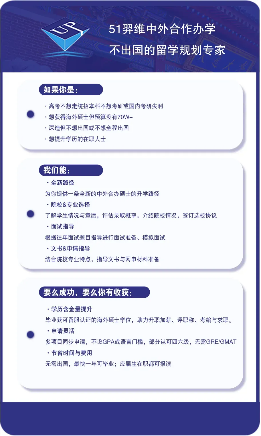 *更多关于硕博项目申请的问题,随时咨询沟通领取评估表关于51羿维中外合作办学
