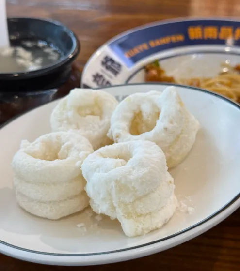 南昌人的过早格外丰富,除了炒粉瓦罐汤,白糖糕更是本地人私藏的美味。老巷子里的小摊清晨就排起长队,糯米磨浆蒸熟揉成长条,拧成麻花状炸至金黄,趁热撒上绵白糖,外酥里软、甜而不腻,配一杯温热瓦罐汤,甜咸中和,便是南昌清晨最实在的快乐。