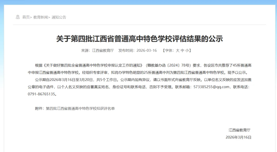 江西省教育厅发布《关于第四批江西省普通高中特色学校评估结果的公示》,确定25所普通高中学校为第四批江西省普通高中特色学校。