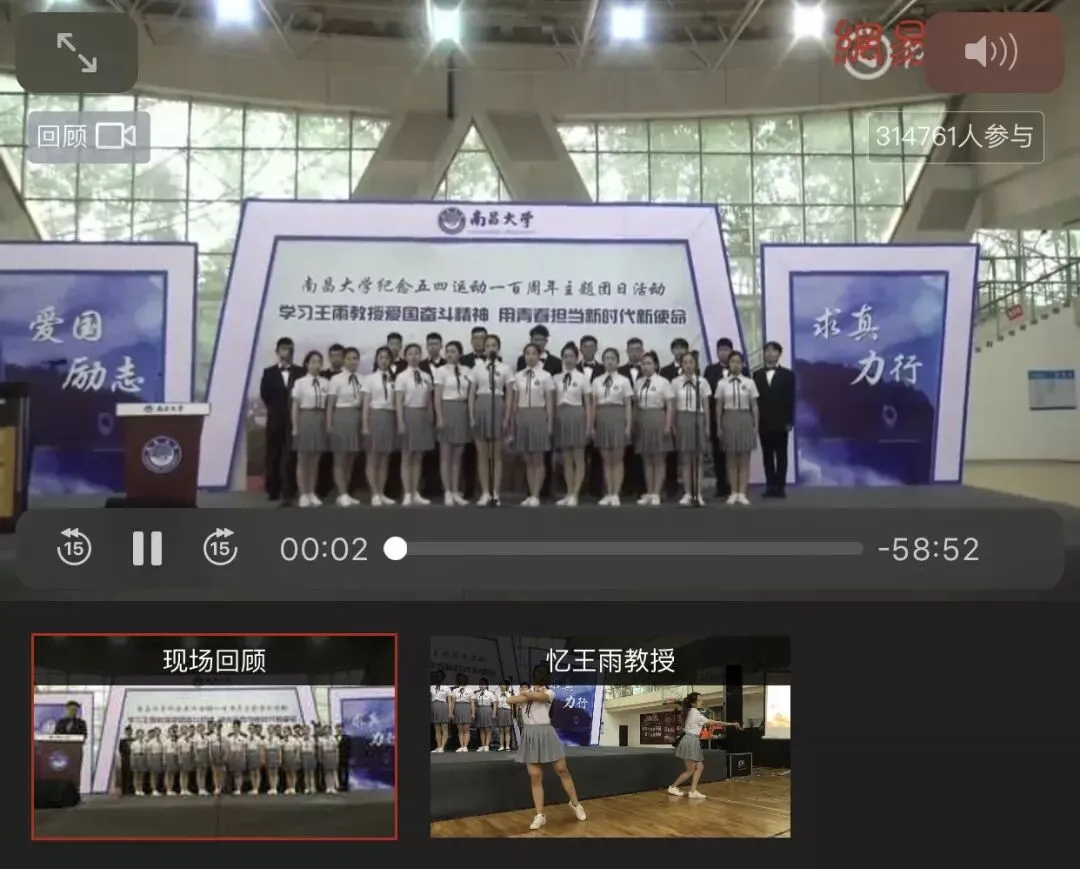现场,师生共同收看了纪念五四运动100周年大会直播节目。南昌大学“学习王雨教授爱国奋斗精神,用青春担当新时代新使命”主题团日活动最终也在《我和我的祖国》的合唱声中落下帷幕。