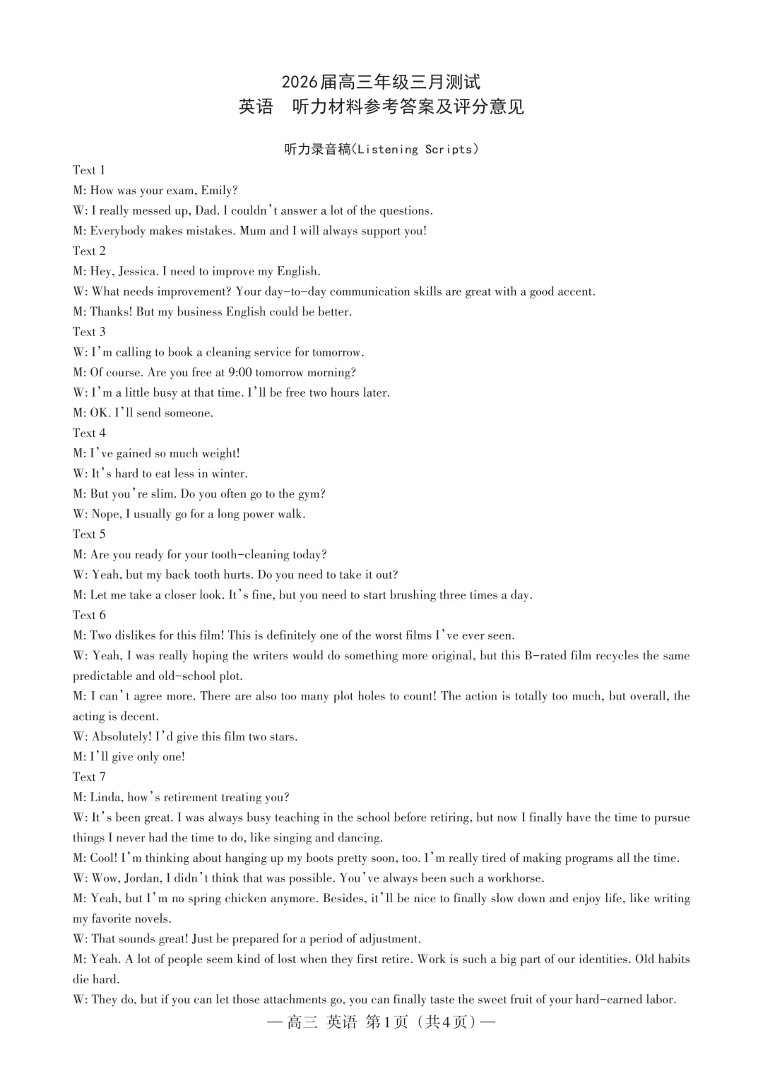 2024年全国新高考英语1卷听力以及听力原稿