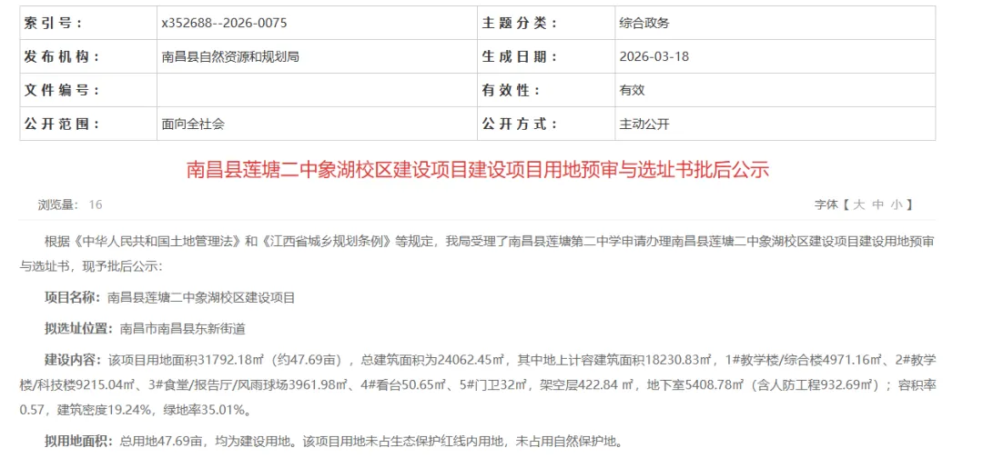 3月18日,南昌县自然资源和规划局正式发布了莲塘二中象湖校区建设项目用地预审与选址意见书批后公示,标志着该校区选址、用地规划全面敲定,后续各项建设工作即将按计划有序推进,象湖新城教育配套迎来重磅升级。根据公示信息,项目用地面积 31792.18㎡(约 47.69 亩),总建筑面积 24062.45㎡。其中地上计容建筑面积 18230.83㎡,包含:3#食堂 / 报告厅 / 风雨球场 3961.98㎡另有架空层 422.84㎡,地下室 5408.78㎡(含人防工程 932.69㎡)。项目规划指标为容积率 0.57,建筑密度 19.24%,绿地率 35.01%。项目拟总投资10379万元。预计开工时间2026年9月,竣工时间2027年9月。校区选址位于金沙三路以西、复兴大道以南。北侧不远处即为昌南体育中心,周边临近桃新大道快速路、复兴大道,交通出行便捷高效;片区内住宅区众多,有煌盛观云、恒大城、幸福时光等成熟住宅区,生源集聚度高,便民办学属性凸显。