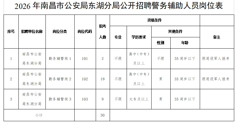 (二)招聘岗位:此次员额制辅警招聘共设3个岗位,详见《2026年南昌市公安局东湖分局公开招聘警务辅助人员岗位表》
