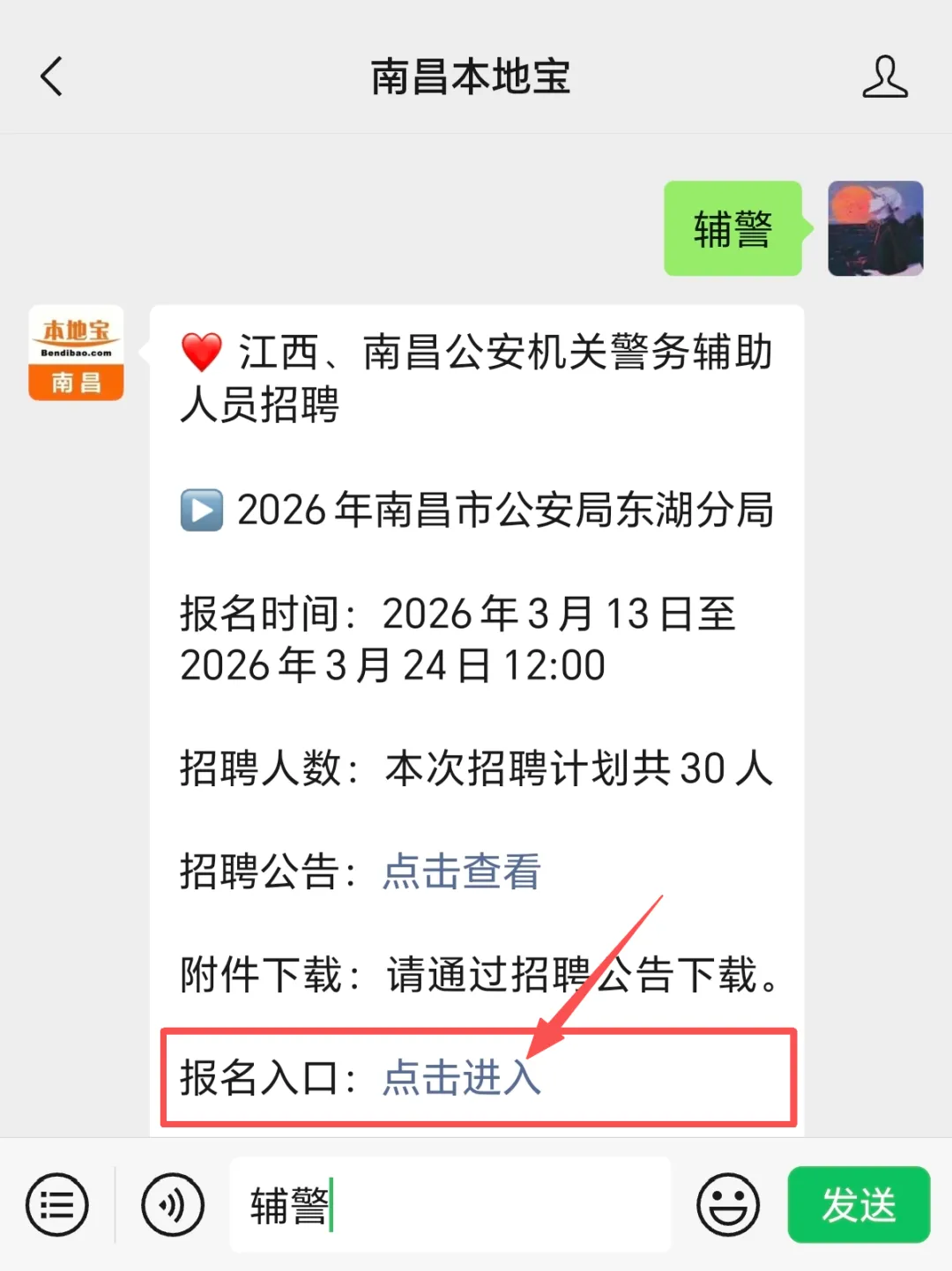 小编提醒:大家也可以扫描下方二维码,关注后进入【南昌本地宝】,在聊天对话框回复【辅警】,即可直接获取南昌市公安局东湖分局辅警招聘报名入口、招聘条件、完整招聘公告。