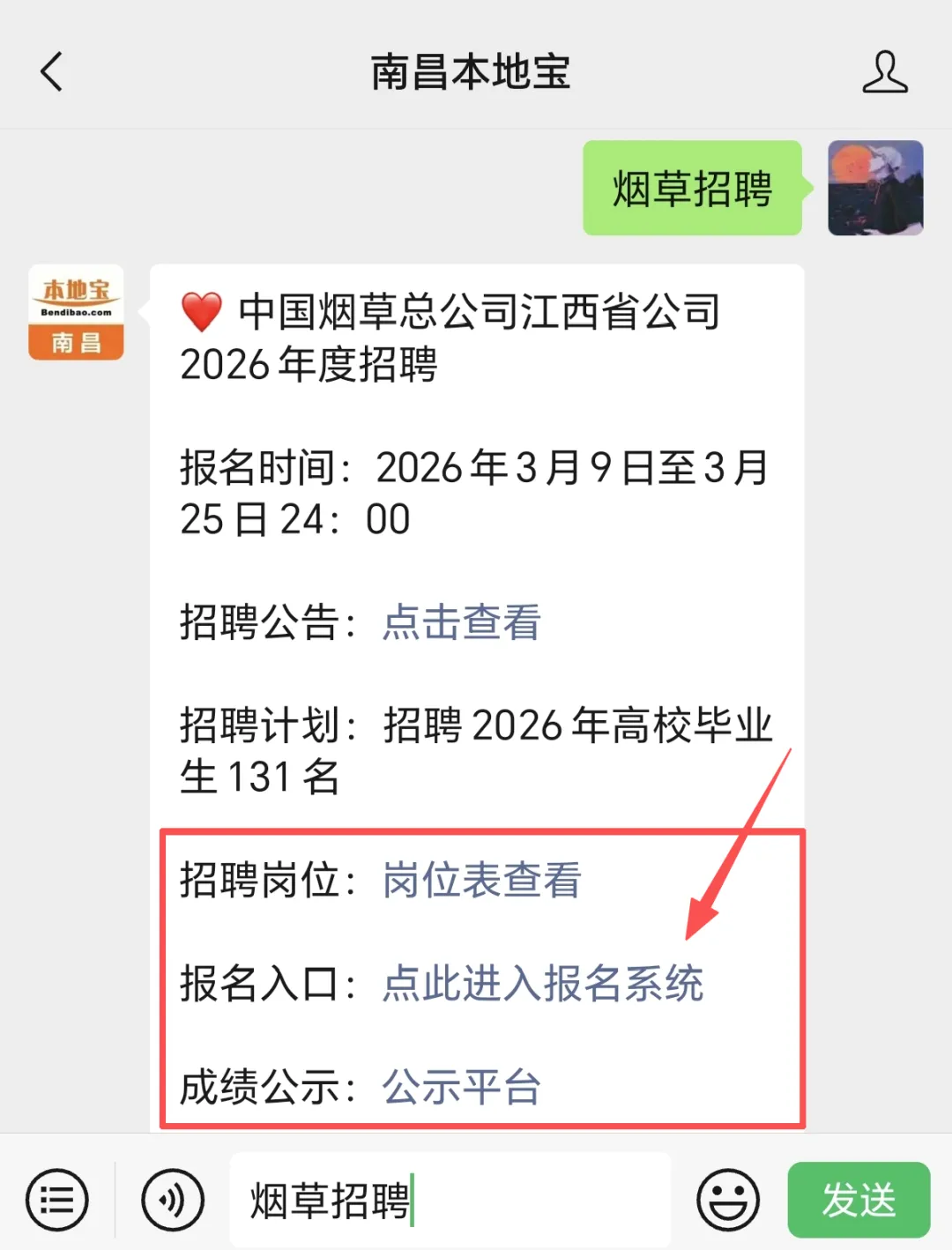 小编提醒:大家也可以点击下方名片,大家也可以扫描下方二维码,关注后进入【南昌本地宝】,在聊天对话框回复【烟草招聘】,即可直接获取中国烟草总公司江西省公司报名入口、招聘岗位表、招录考试程序、完整招聘公告(可下载附件)。
