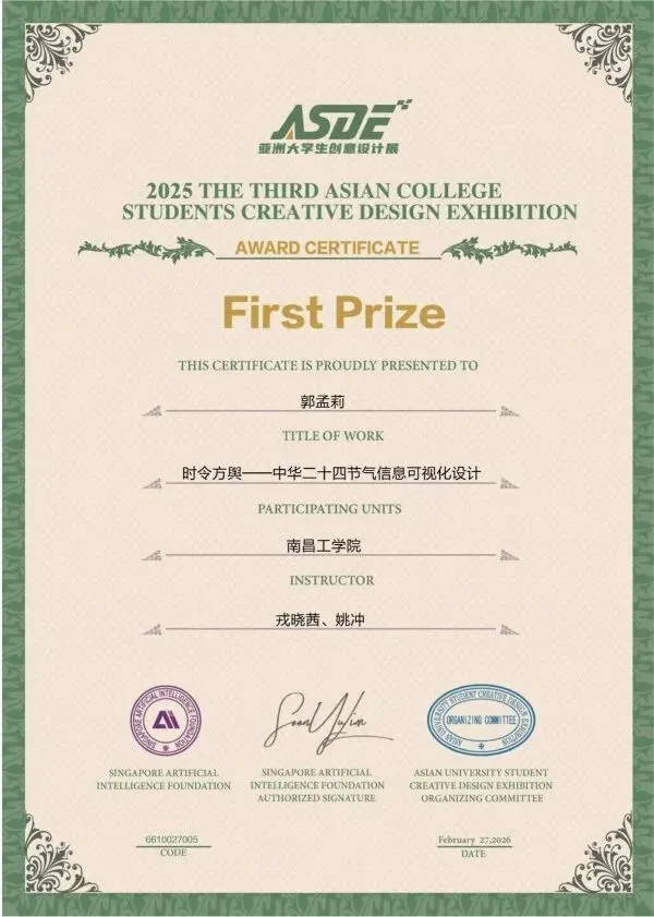 在本次赛事中,作品亮点纷呈:郭孟莉同学的《时令方舆——中华二十四节气信息可视化设计》荣获一等奖;王宝羲同学的《婺源“三雕”》、邹细军同学的《君臣佐使四君子汤信息可视化设计》分别斩获二等奖。多位教师作为指导老师,全程为学生提供专业指导与支持,助力作品在国际舞台上绽放光彩。