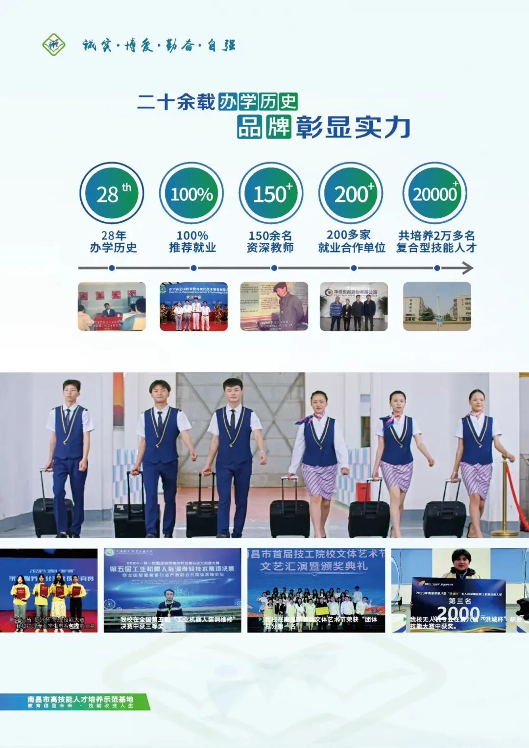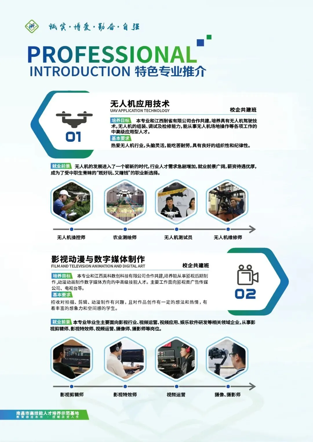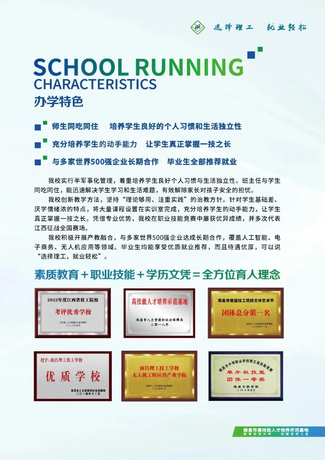 学校师资力量雄厚,专业建设成果显著。2024年,获批南昌市无人机工程应用产业学院,电子技术专业获评省级精品专业,计算机应用与维修专业为南昌市特色专业。学校师生在市、省技能大赛中屡获佳绩,并代表江西参加国家级竞赛。学校多次获评江西省人社厅优秀技工学校称号,并先后荣获“人社部全国技工院校工学一体化建设院校”“南昌市高技能人才培养示范基地”“南昌市职业技能师资培训基地”等荣誉。此外,学校与多所高校搭建升学通道,毕业生可通过单招考试或普通高考,获取全日制大学文凭。