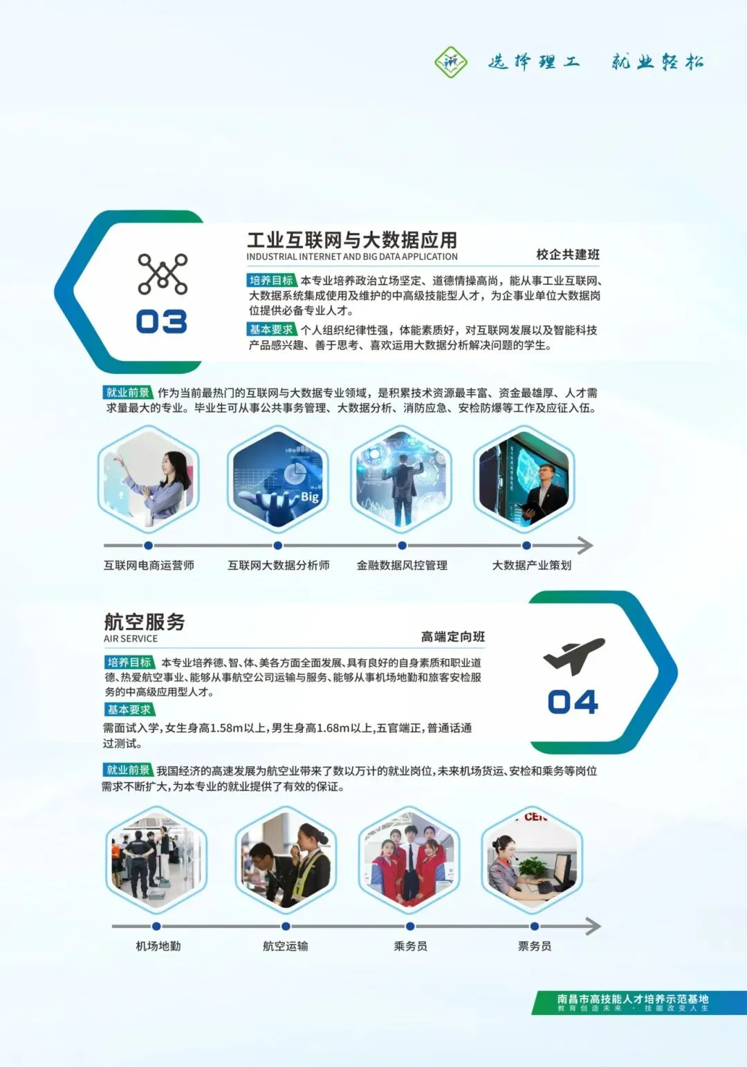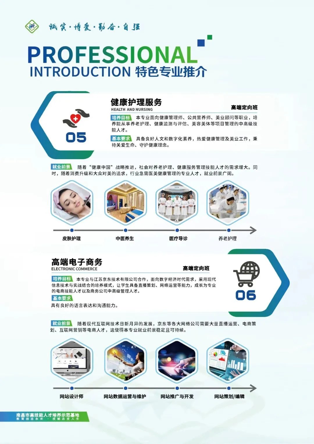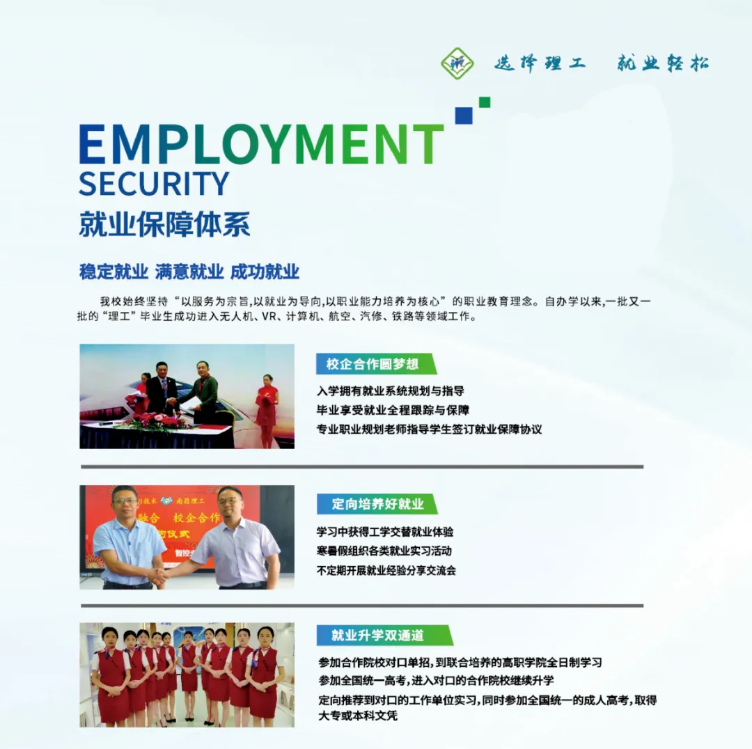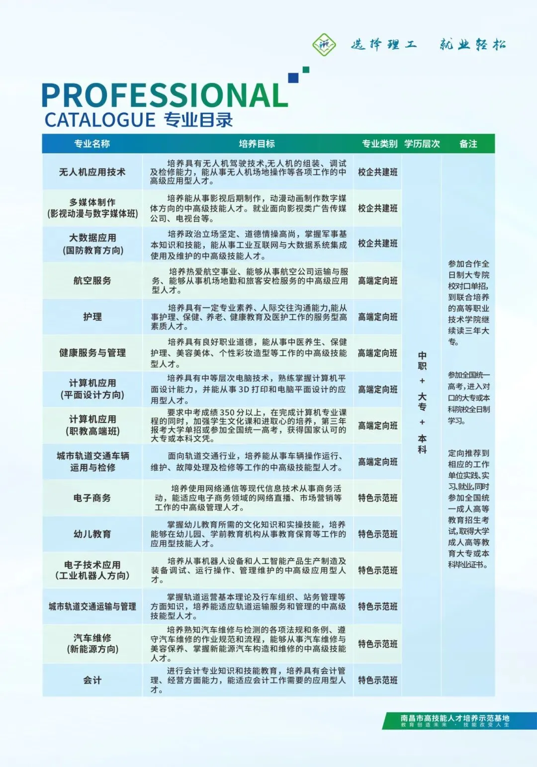 学校师资力量雄厚,专业建设成果显著。2024年,获批南昌市无人机工程应用产业学院,电子技术专业获评省级精品专业,计算机应用与维修专业为南昌市特色专业。学校师生在市、省技能大赛中屡获佳绩,并代表江西参加国家级竞赛。学校多次获评江西省人社厅优秀技工学校称号,并先后荣获“人社部全国技工院校工学一体化建设院校”“南昌市高技能人才培养示范基地”“南昌市职业技能师资培训基地”等荣誉。此外,学校与多所高校搭建升学通道,毕业生可通过单招考试或普通高考,获取全日制大学文凭。