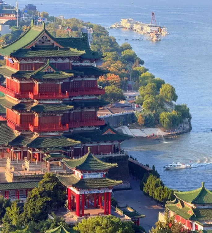 滕王阁就在江边,楼不算最高,牌面很大,王勃写下那句“落霞与孤鹜齐飞”,现在上楼看江,天好时能对上那画面。