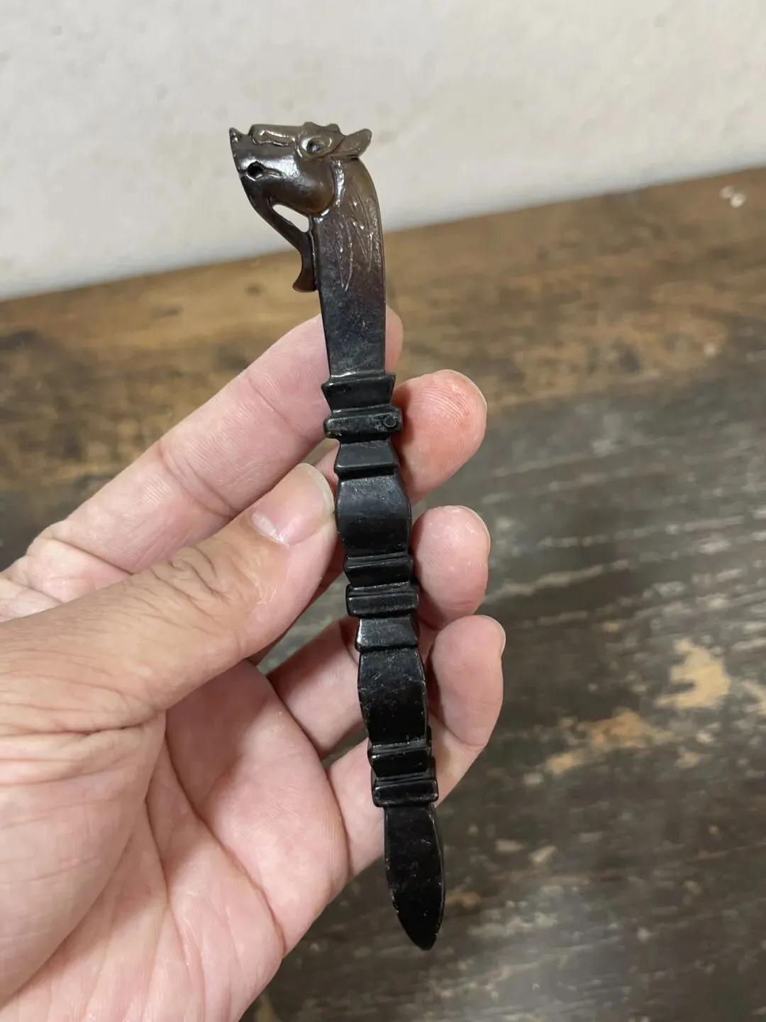 龙首是最顶端造型,代表权威和祥瑞与守护,竹节则是寓意节节升高君子有度,是民间读书人传统的吉祥材料之一,书拔和茶拔,是底部的尖锐处拔取茶叶的实用功能,也可作为发簪使用。