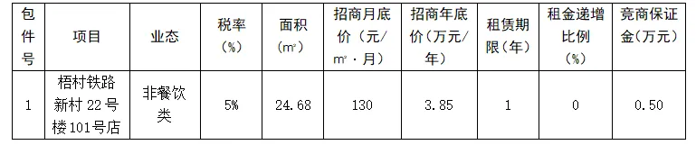 1.招商期限:本次招商项目租赁期限详见招商项目表。2.租金缴纳及税费事项:本次招商底价均为含增值税单价(租金+增值税),本批次包件增值税税率为5%(该税率仅为参考,最终税率以签订合同时税务部门规定缴纳税率为准)。3.租金递增比例:本次招商项目租金递增比例详见招商项目表。4.招商文件费用:300元/包件(售出不退,仅提供电子版本)。(1)线上报名。凡有意参加本项目的竞商人,请于2026年3月19日至2026年3月27日(每日9:00时至11:00时、14:00时至17:00时,节假日除外,逾期不受理)在国铁招商平台(https://zs.95306.cn)注册并报名(首次报名前完成注册)。国铁招商平台报名具体操作方法请查阅该网站首页底部“帮助中心”的“常用文件”或咨询网站客服电话010-95306-8-3。若无法操作,可至招商人指定办公地点委托授权工作人员协助办理。(2)线下报名。在国铁招商平台注册并报名成功后,于2026年3月19日至2026年3月27日(每日9:00时至11:00时、14:00时至17:00时,节假日除外,逾期不受理)在招商人指定办公地点持公司营业执照复印件、法人代表身份证明或委托人身份证明,委托人另携带法人代表授权委托书;(自然竞商人带本人身份证明)、竞商报名表、转账凭证复印件(汇款凭证备注信息格式“招商编号+包件号+标书费”)、国铁招商平台网上报名截图(非自然竞商人提供的所有材料均需加盖公章)进行现场报名。2.招商人指定办公点地址:厦门市思明区厦禾路900号厦门车站综合事务办公室 3.招商文件获取方式。竞商人报名成功后,到招商人指定办公点领取招商文件,但购得招商文件者不作为当然竞商资格确认。(请在汇缴单证“用途”栏中注明“×××企业竞商×××项目竞商××包件招商文件购买费”)4.现场勘查时间:2026年3月27日17:00前,竞商人自行勘查。5.凡对本次招商文件提出询问,请于2026年3月27日17:00前与招商人联系。6.竞商人必须向招商人购买招商文件并登记备案,且竞商人报名时须明确所参与竞商的包件号,报名时间结束竞商人一律不得更改已报名的竞商包件,且竞商人不得参与未报名包件的竞商,否则按无效竞商处理。本次招商公告在国铁招商平台(https://zs.95306.cn)上发布。*重要提示:根据《国铁集团经开部关于国铁招商平台上线试运行有关事项通知》(经开产业函[2020]26号)要求,所有竞商人须在国铁招商平台网站上注册并报名,国铁招商平台(https://zs.95306.cn)线上报名方式:首次登录国铁招商平台网站:(https://zs.95306.cn)按要求进行注册后,进行网上报名。具体操作方法请查阅该网站首页底部“帮助中心”的“常用文件”或咨询网站客服电话010-95306-8-3。2026年3月19日