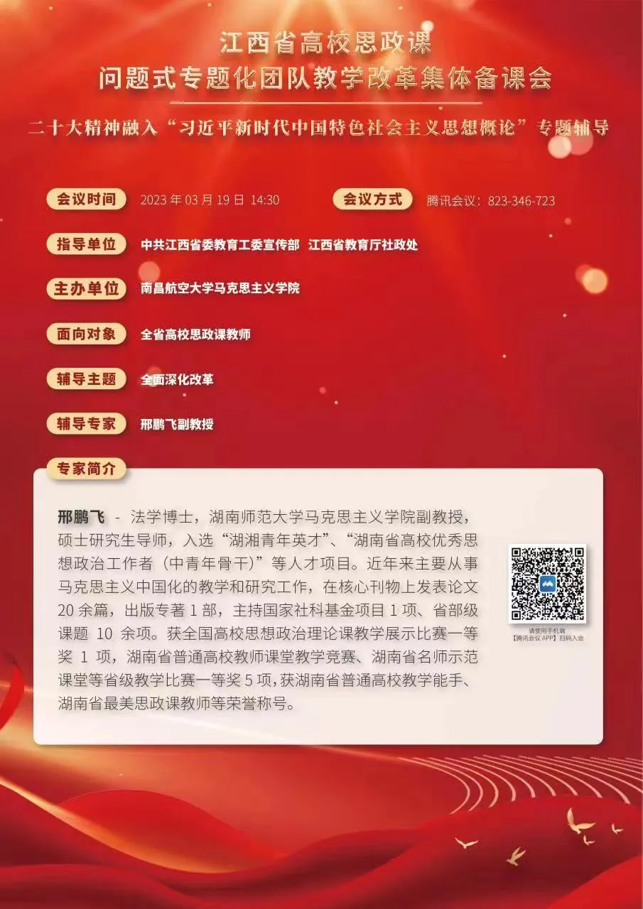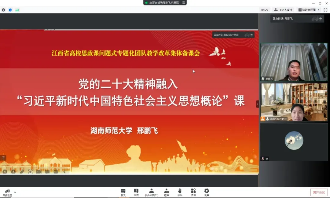 为深入学习贯彻党的二十大精神,进一步推进党的二十大精神进《习近平新时代中国特色社会主义思想概论》课程,增强思政课的思想性、理论性。3月19日下午,南昌航空大学马克思主义学院举办了江西省高校思政课问题式专题化团队教学改革集体备课会。此次备课会特别邀请湖南师范大学马克思主义学院副教授邢鹏飞博士作为辅导专家。会议由南昌航空大学马克思主义学院思政课教师卢艳兰副教授主持,《习近平新时代中国特色社会主义思想概论》教研室专兼职教师以及省内外百余名思政课教师参加了本次会议。