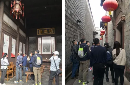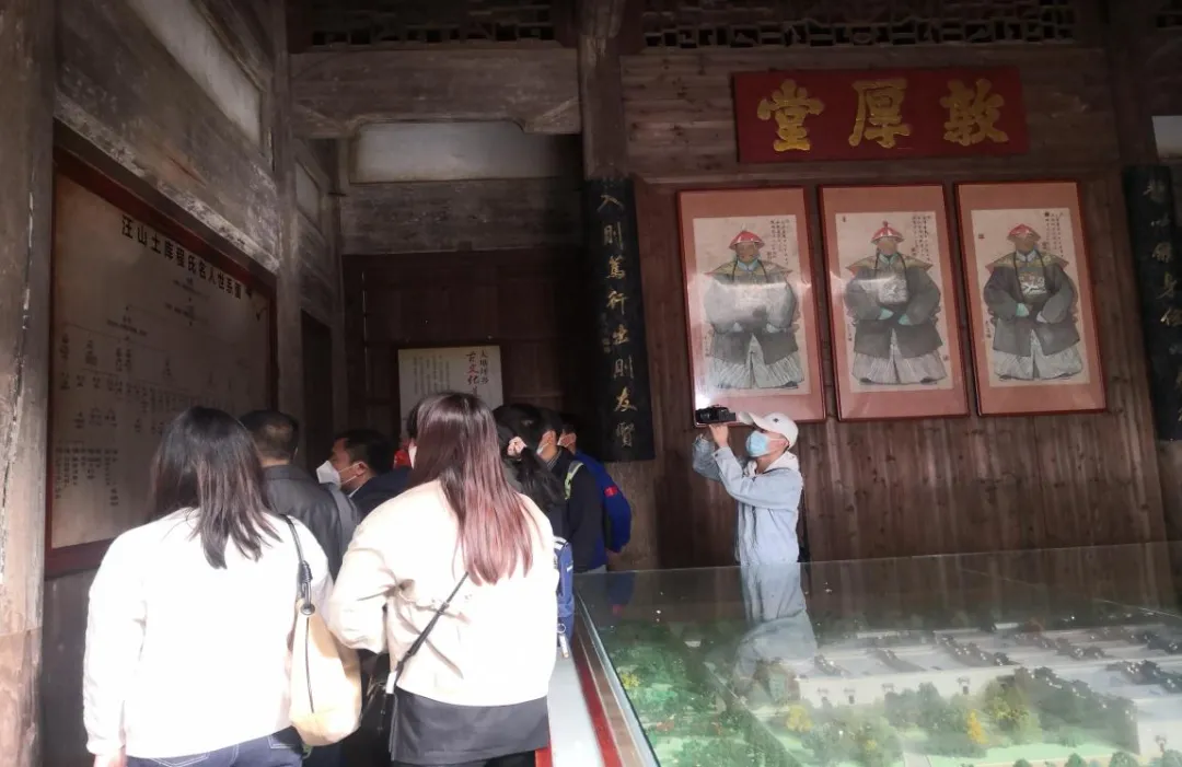 在工作人员的引导和讲解下,一张张历史照片、一件件文物古迹,一栋栋深宅大院深深地吸引着大家的心神,整座建筑内巷道纵横交错,从敦厚堂、保仁堂、退思堂、稻花香馆到望庐楼,不论是雕栏彩绘,还是门堂对联,都会引发大家的思考和驻足流连;其中“八尺巷”是建筑群里一条横贯东西的交通要道,据讲解员介绍,是专供主人车马接送的行驶路线。穿过“八尺巷”,从古颐堂、光浴堂、诵芬堂、醉月楼到最后的祖堂,大家发现土库里每纵深之间正房与厨房之间均有隔巷,且门不相对,向讲解员询问才知,这是以防出现火灾相互蔓延的防护措施。隔巷下面埋有很多瓦缸,有回声的效果,显示出土库的威严,亦可蓄水防火。