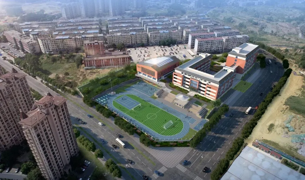 2025年3月开工,目前2栋教学楼外墙已完工,进度较快,预计2026年8月竣工、下半年投用。学校规划12班,提供540个学位,配套综合楼、食堂、风雨球场等设施——