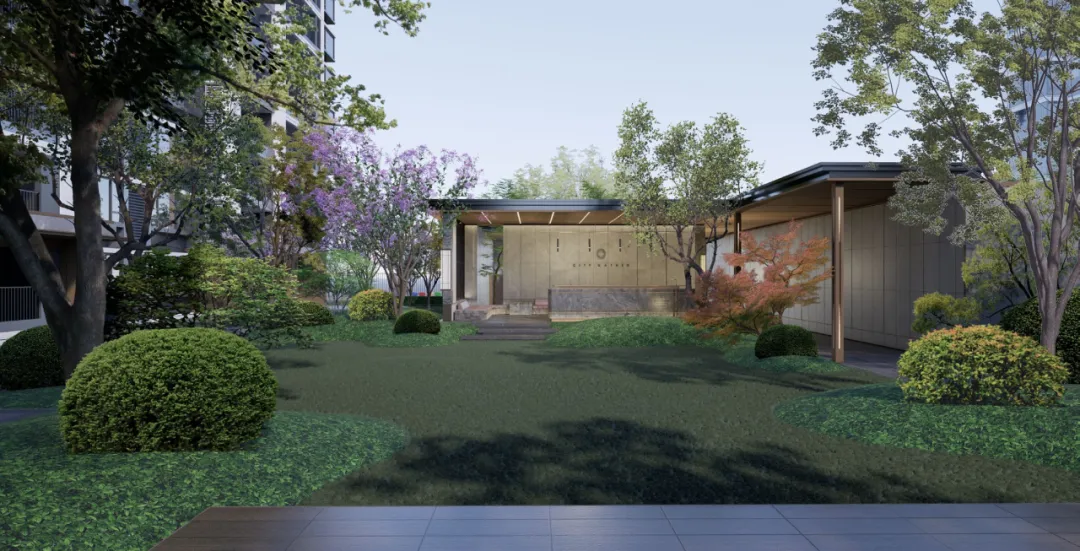 从归家体验看,从踏入社区的第一步起,便是一场步步生辉的仪式。门、亭、廊三重礼序层层递进;脚下的“聚宝盆”铺装,将四方福气聚于门前;中庭的乌桕林四季更迭,象征家运生生不息;夜幕下,玉兔雕塑点亮园境,寓意阖家美满。
