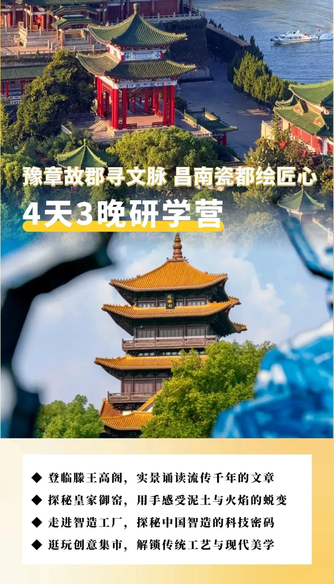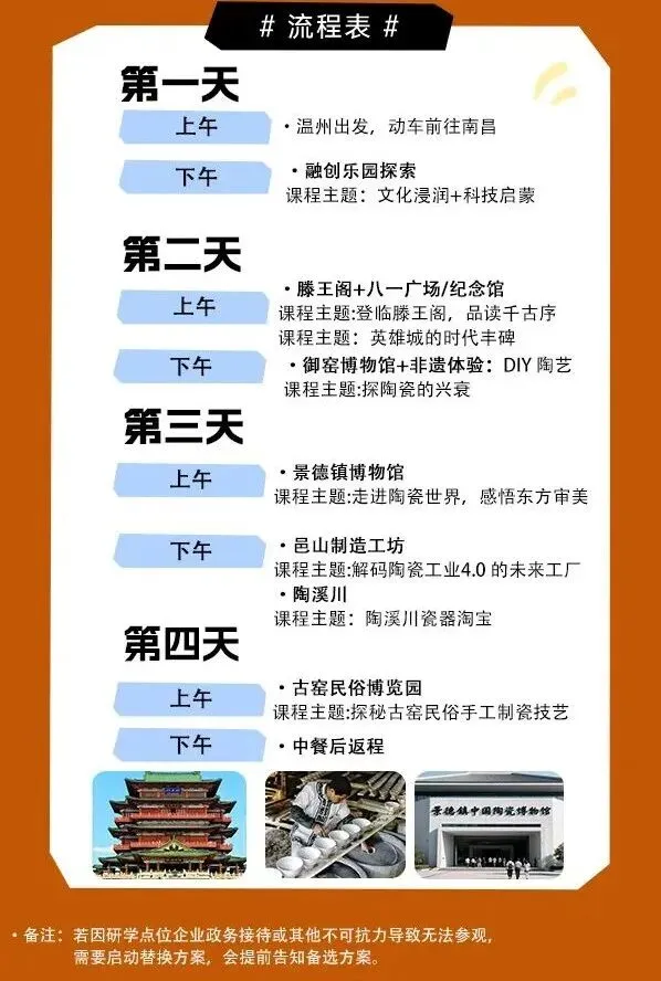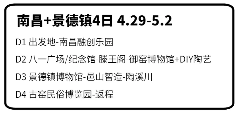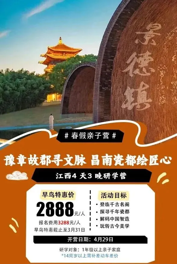 ②从行程上说,第一天到达以后先玩融创乐园,游乐园永远是小孩子的最爱,4月29日应该可以玩得尽兴,游乐场开到8点;后面的行程涵盖南昌、景德镇景点,而且设置了多项研学课程。