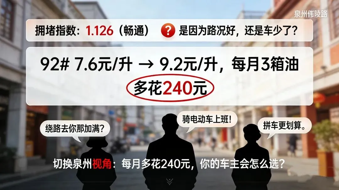 如果你是泉州车主,92号从7.6元涨到9.2元,每月加3箱油多花 240元——你会怎么做?