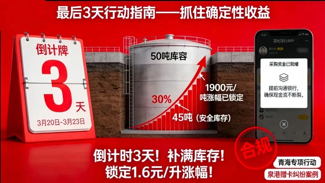 今天是3月20日,距离调价仅剩3个工作日。1900元/吨的涨幅已锁定,本周日前必须补至安全库存上限。以50吨库容为例,建议补至45吨以上。