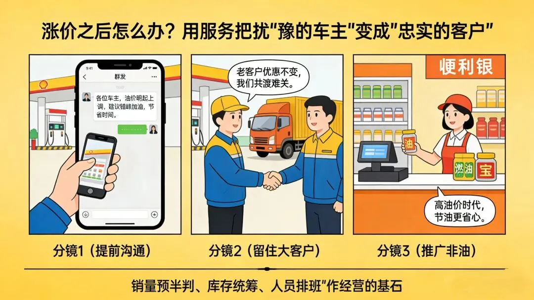 加油站管理者应提前做好 销量预判、库存统筹及人员排班,合理调配资源,避免出现供需失衡或资源浪费。同时要持续提升服务效率,规范现场操作,积极防范各类矛盾纠纷,保障车主消费体验,防止客户流失。-