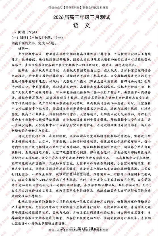 1.(3分)C【解析】A项,材料一第1段说明太空数据增长、地面成本攀升是推动各国研究太空数据中心的主要原因,而非“设立”的全部缘由。“多方面需求”才是促使其走向现实的驱动力。B项,“天数天算”可弥补“天数地算”的不足,但原文并未提及“可以彻底取代'天数地算’”。D项,材料一第3段指出,安装外部隔热设施能应对太空温度剧烈变化的问题,而太空数据中心还需解决宇宙辐射、空间碎片碰撞、专属散热等多重难题。“保障重力环境下设备稳定运行”需要多方面发力,不只是温度变化问题。