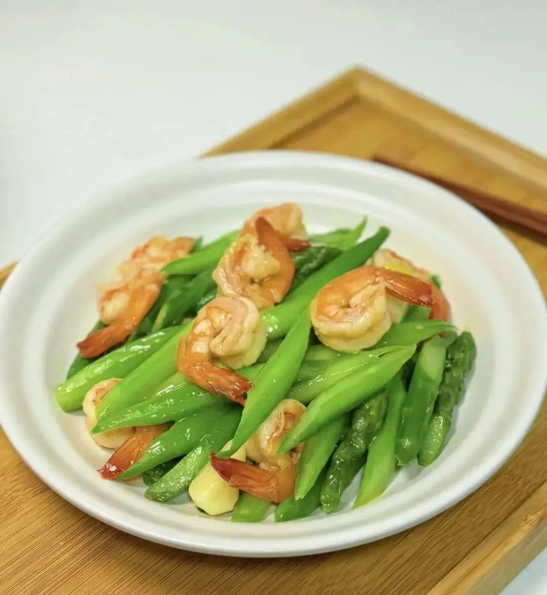 红米米饭、芦笋炒虾仁、清炒生菜、板栗红枣筒骨汤