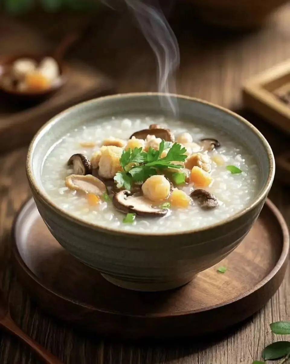 芝麻米饭、双菇烩牛肉丝、蒜香空心菜、山药排骨汤