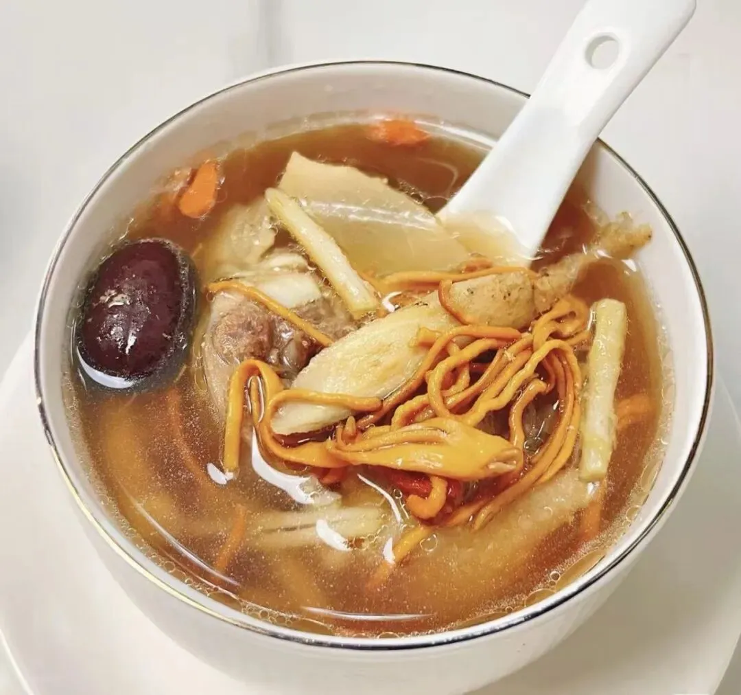 藜麦米饭、豆条红烧肉、素炒莴笋片、虫草花鸡汤