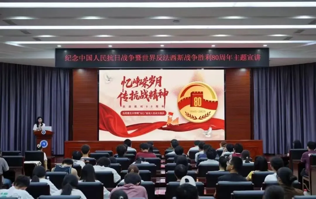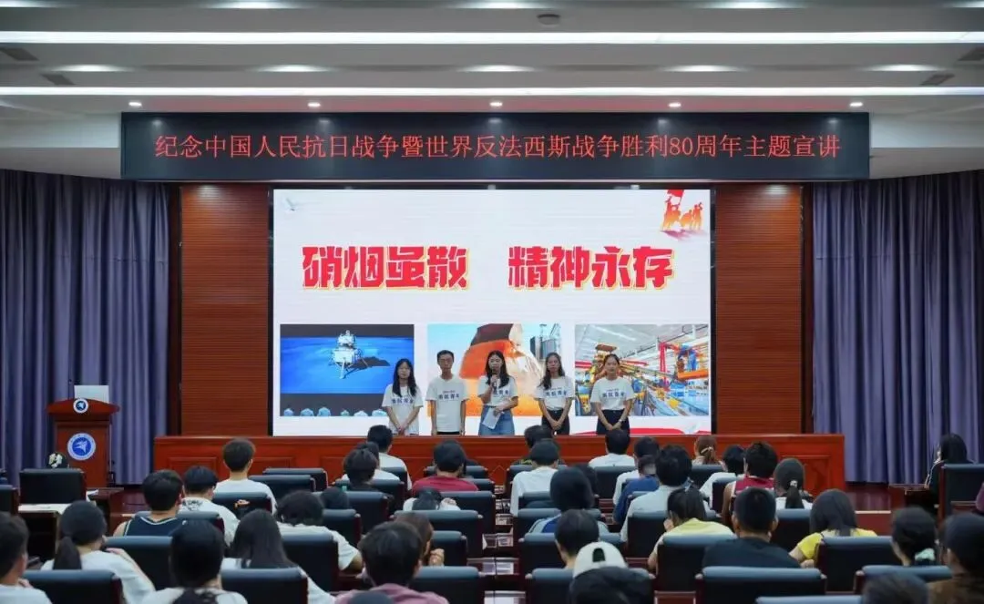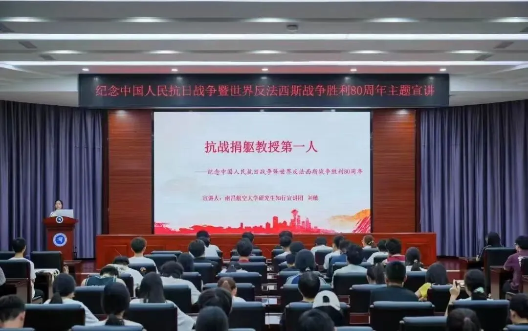 9月4日,为纪念中国人民抗日战争暨世界反法西斯战争胜利80周年,引导广大学子传承红色基因、传承伟大抗战精神,南昌航空大学在逸夫楼第二报告厅举办了“那时少年,此时青年——一场跨越时空的信仰对话”抗战故事青年说主题宣讲活动。来自校院学生会、研究生会以及校“航大英才”骨干培训班的160余名学生代表齐聚一堂,共同聆听抗战故事,传承和弘扬伟大抗战精神。南昌航空大学马克思主义学院学子积极参与到此次宣讲活动中。