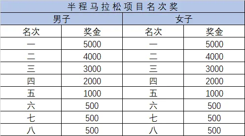半程马拉松项目,取男、女前八名进行奖励,税前奖金如下表(单位:人民币/元):