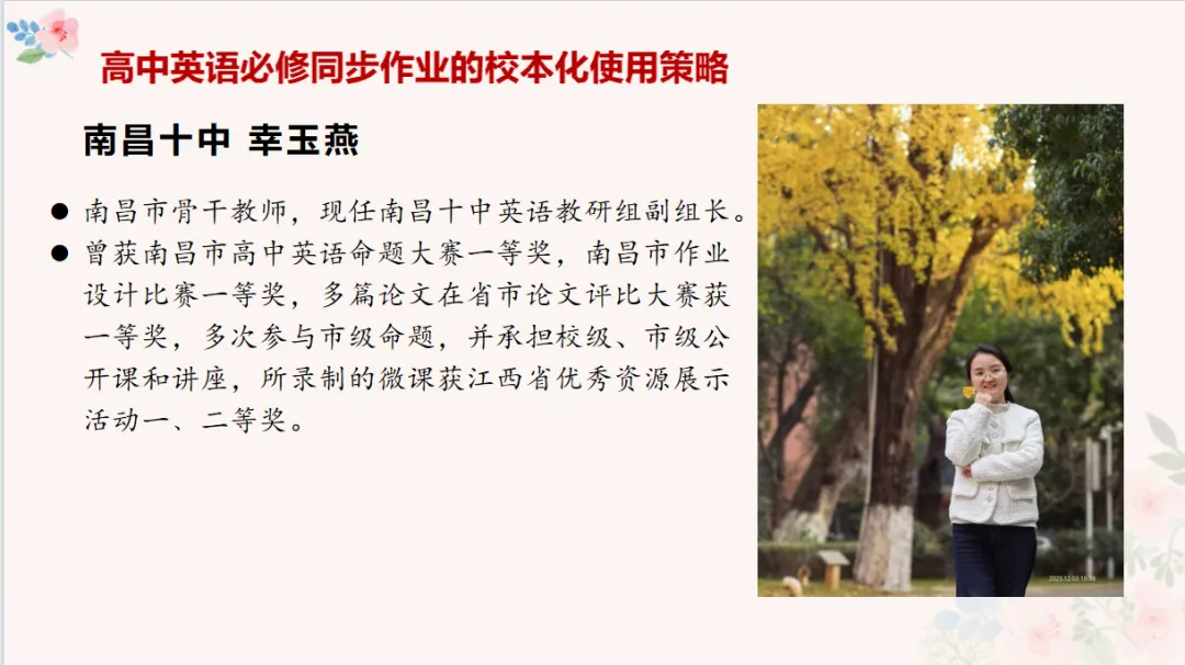 会议最后,市教研员熊姿对上学期教研工作进行全面总结,并对新学期重点任务作出系统部署。上学期,我市高中英语教研成果丰硕:在江西省作业设计大赛等各级赛事中斩获佳绩,省资源包建设稳步推进,实现了从“拿来主义” 到 “精准增效” 的转变,通过下校视导助力青年教师成长,优秀教师示范引领作用充分彰显。