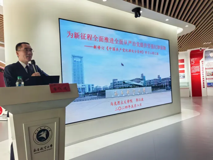 为推进党纪学习教育走深走实,进一步加强党的纪律建设,强化党员的廉洁意识和法纪观念,提高党员党性修养,南昌航空大学马克思主义学院党委聚焦“学纪 知纪 明纪 守纪”主题,开展五个“一”活动,即“一次理论集中学习、一次红色家风洗礼、一场主题党日活动、一期中国精神宣讲、一次现场大讨论”活动,推进党纪学习教育入脑入心。本次活动也是马克思主义学院入党积极分子培训和党员集中培训的重要内容。一次理论集中学习。5月8日上午,在党建创新实践中心先锋工作室,新时代赣鄱先锋、学校纪委委员、学院纪检委员、习近平新时代中国特色社会主义思想概论课教研室党支部书记李江波以“为新征程全面推进全面从严治党提供坚强纪律保障”为题,围绕“深刻认识修订《条例》的重要意义”“准确把握《条例》修订的主旨要义”“切实抓好修订《条列》的贯彻执行”进行了讲授,带领入党积极分子、学生党员尤其是毕业班党员集中学习《条例》,为大家上了一次廉政教育党课。他寄语毕业班党员,在人生道路上,要以坚定马克思主义信仰,牢固树立纪律意识,学纪、知纪、明纪、守纪,保持对纪律的敬畏之心,时刻遵守廉洁纪律,始终不越“雷池”、不踩“红线”、不破“底线”。