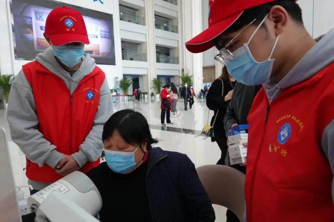 志愿者们统一身着红马甲,在南昌大学第二附属医院红谷滩分院的门诊部为前来就诊的患者提供导诊便民服务,为患者和家属指引就医路线、指导使用自助机、打印检验结果等。