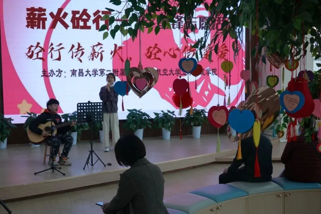 忙碌的“红马甲”志愿者们,成为医院一道亮丽的风景线。他们积极、主动、热情的服务受到了医务人员的肯定和患者的广泛好评。学生志愿者在服务患者的同时,也深刻体会到了帮助他人的成就感和奉献感。志愿者汤冰感慨地说:“今天我和同学们做的只是一件件小事,但平凡的举动也可以在不经意间给人温暖。其实,我们每个人都可以成为‘雷锋’。”志愿者欧友农为听众们送上了吉他弹唱《父亲》《理想》《八十年代的歌》等曲目,赢得热烈掌声。他说,在弹奏吉他的时候,内心充满力量。今天的志愿服务活动对他帮助很大,日后将以更大的热情参与到活动中来,传播青春正能量,积极帮助他人,提升自我价值。自去年11月与南昌大学第二附属医院红谷滩分院开展合作以来,南昌航空大学土木建筑学院“砼”行志愿服务队已开展16次活动,总志愿服务时长为340小时。双方还将继续围绕志愿服务、医社联动等内容推进相关工作。