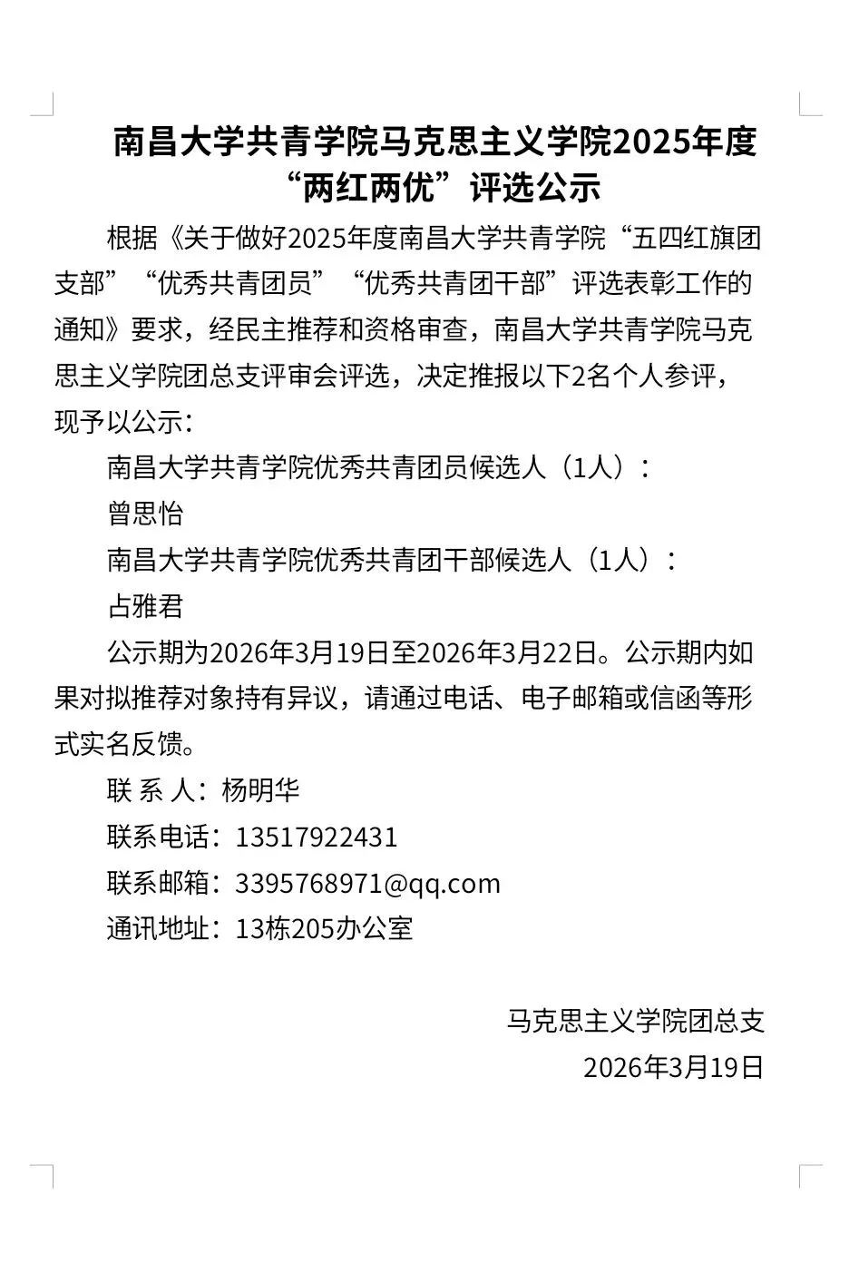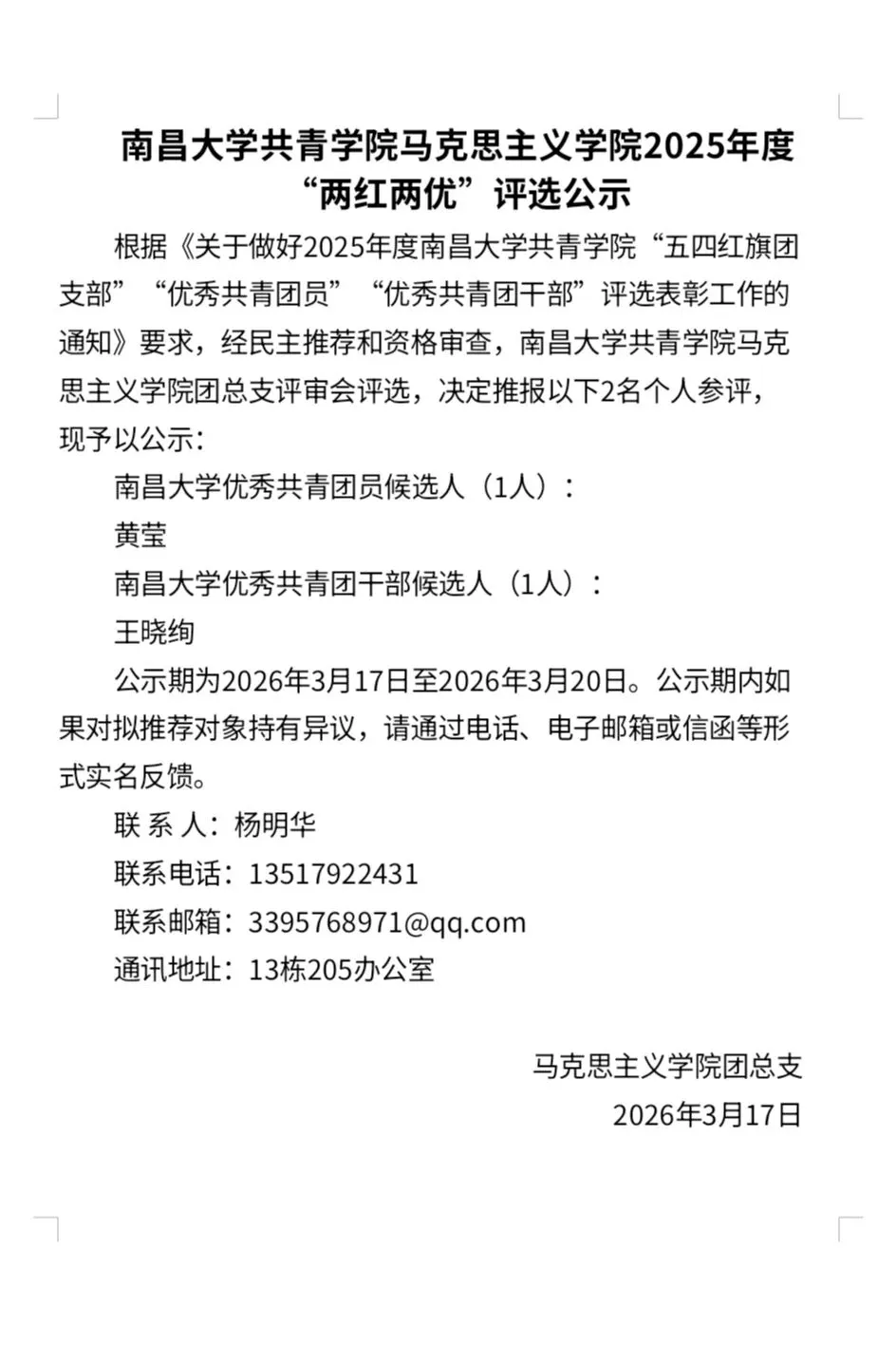 >南昌大学共青学院马克思主义学院2025年度“两红两优”评选公示