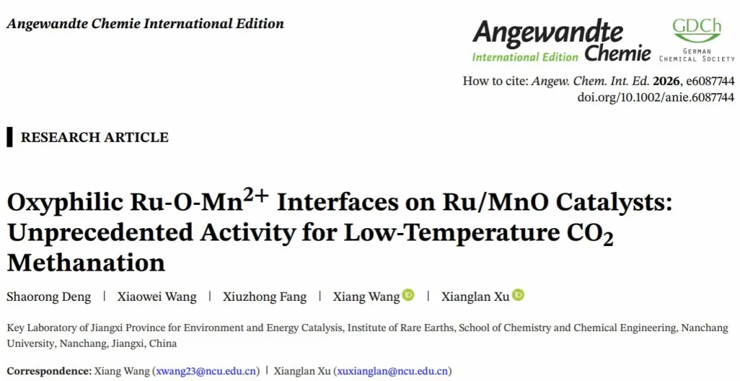 本网讯(化学化工学院)近日,我校化学化工学院王翔教授和徐香兰教授团队在CO2催化转化领域取得重要研究进展。该团队设计并制备了具有高亲氧性界面的Ru/MnO催化剂,实现了创纪录的低温CO2甲烷化反应活性。研究成果以“Oxyphilic Ru-O-Mn²⁺ Interfaces on Ru/MnO Catalysts: Unprecedented Activity for Low-Temperature CO2 Methanation”为题,发表在国际化学领域Top期刊Angewandte Chemie International Edition上。
